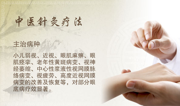 中医眼科以新疆中西医眼科学会副主任委员、新疆自治区中医院前眼科主任王鸿雁为首,传承祖国源远流长的中医文化,结合现代化理念与方式,通过望、闻、问、切等辨证方法好结合现代化的诊疗设备,运用针灸、熏蒸、按摩、中药离子导入等方式,在视疲劳、结角膜病、斜弱视、葡萄膜病、近视、干眼症、慢性疑难眼病和各类疑难慢性眼底病有独特的优势。